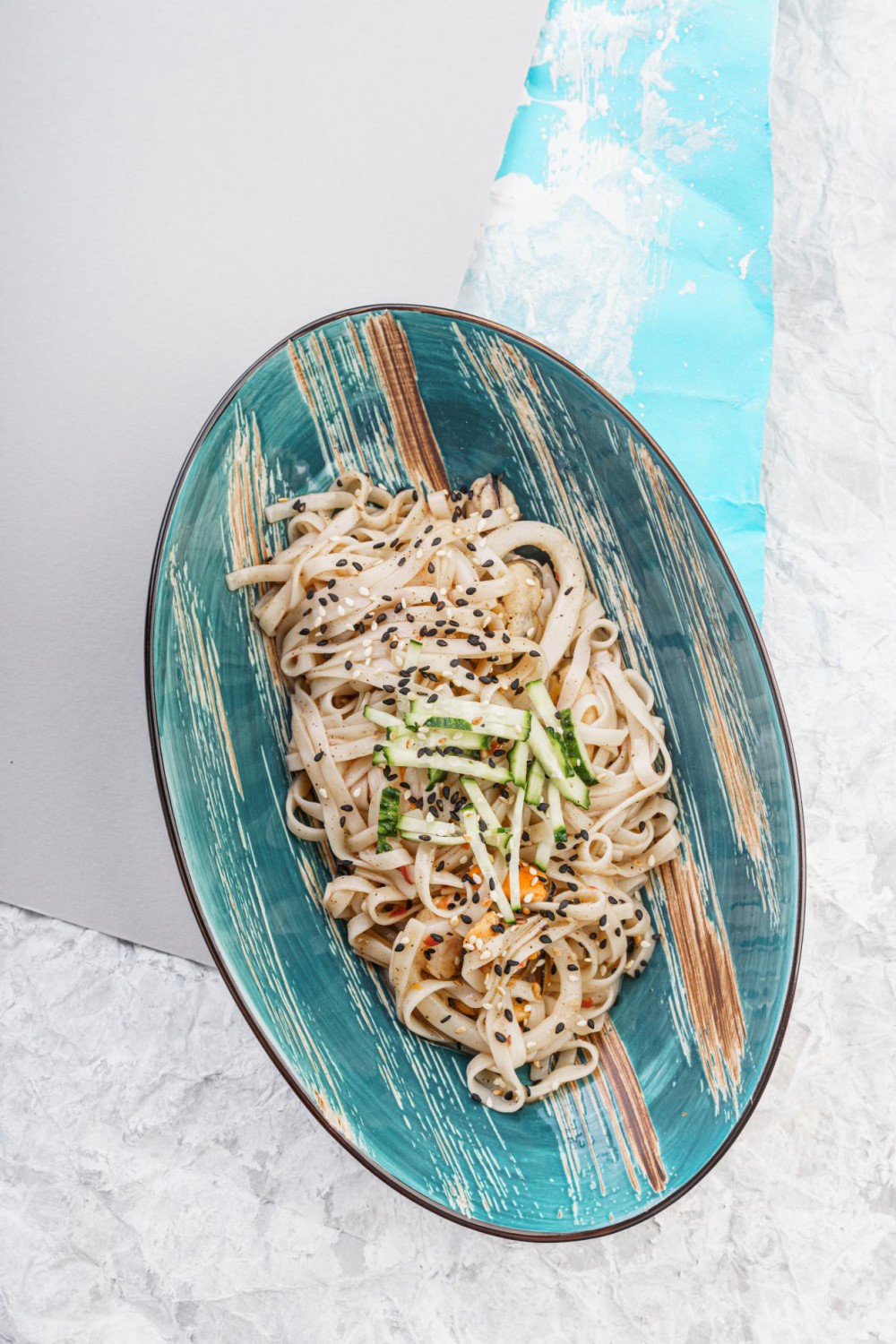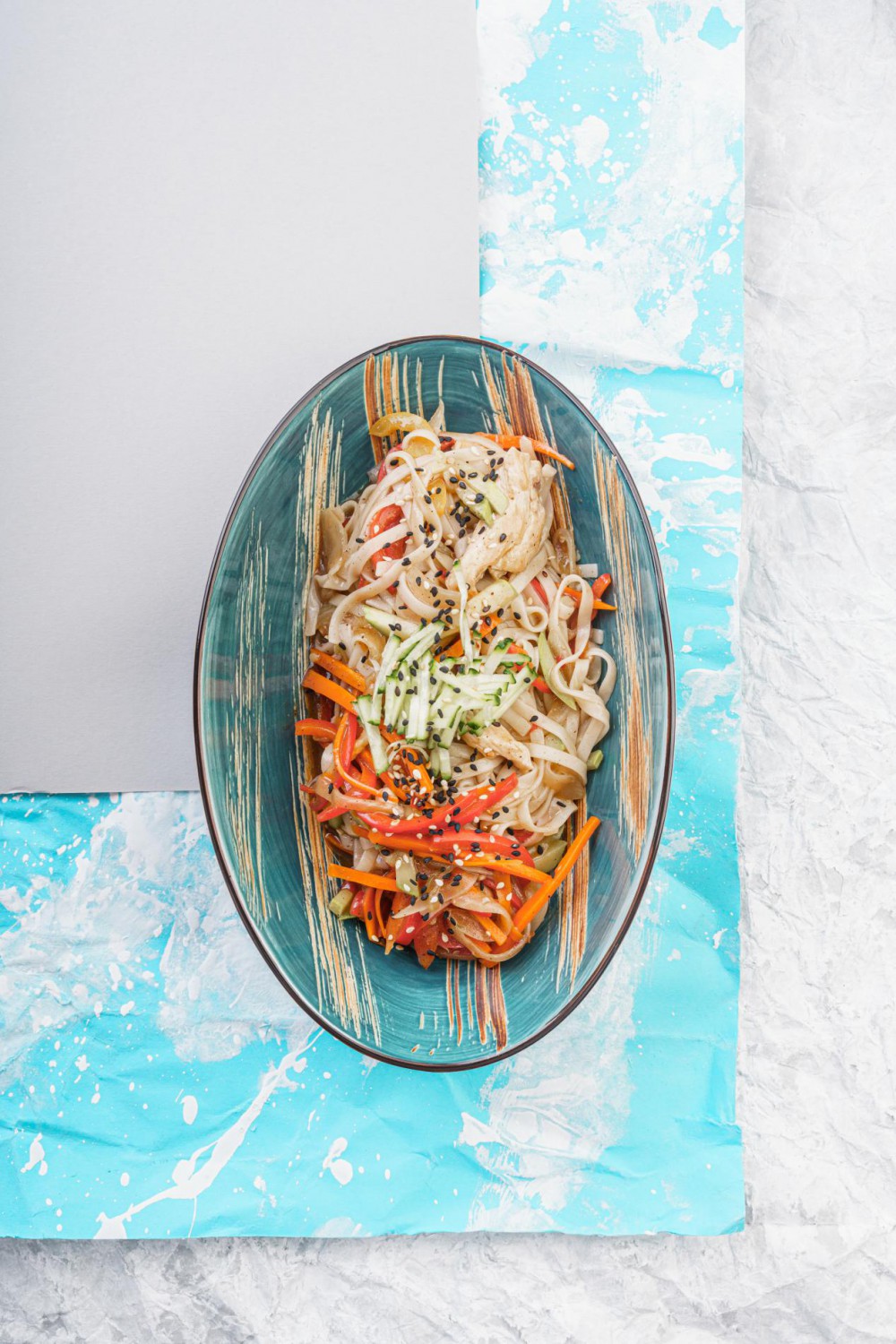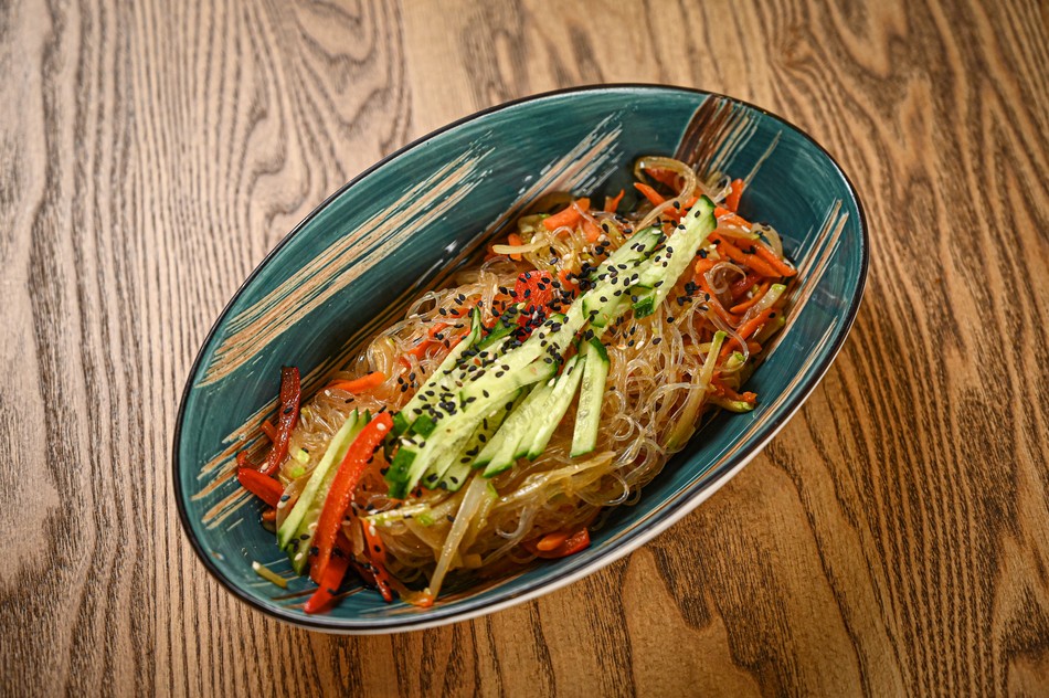 фунчоза, овощи, говядина вырезка, соус, огурцы, кунжут